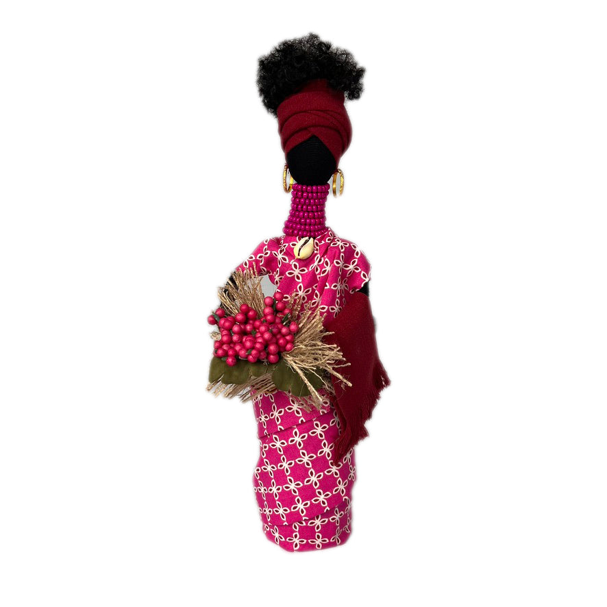 Lena is dressed in a sweet pink and burgundy patterned dress which is accented with a soft shawl over her arm and a matching turban. She carries a basket of straw and plum berries. She wears a plum beaded choke necklace and a seashell brooch. Measures 14 inches tall.