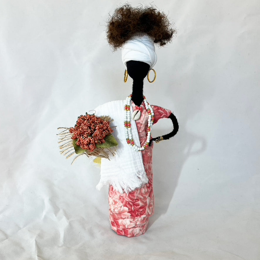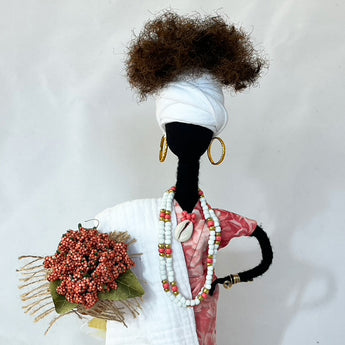 Rosie flaunts her beautiful bronze hair. She is wearing a pink flowered dress with a sparkle of gold in the pattern. Her dress is accented with a white shawl and turban. She carries a basket of pale pink berries. She wears a white, pink and gold  beaded necklace and a shell brooch to accent her outfit. Measures 14 inches tall.