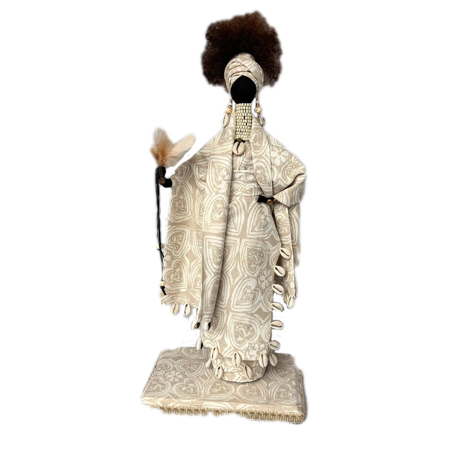 Helen wears a white and tawny geometric heart shape patterned dress which is decorated with sea shells and is adorned with a pearl choker necklace. She holds a bouquet of feathers and beaded embroidery strands. She stands on a matching stand. Measures 20 inches tall.