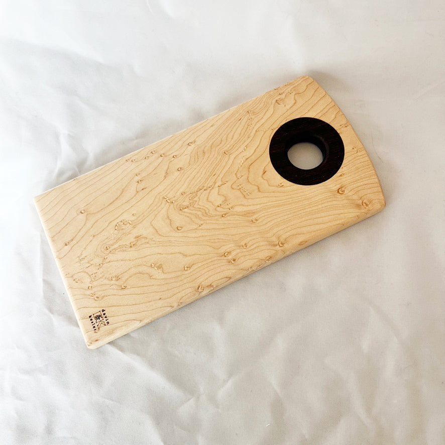 Breadboard/Cutting Board is handcrafted by Davin & Kesler using tiger curly maple and cocobolo wood. Certain to enhance your kitchen and will hold up well for many years of enjoyment. Finished with food grade beeswax. Hand wash. Large Board Measures 11"x5.5".