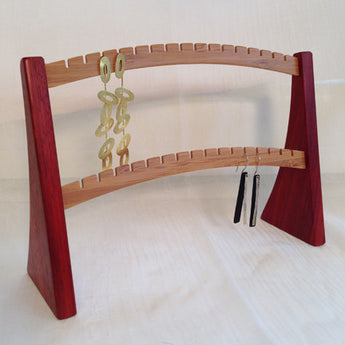 Earring Stand features inserts for 16 pairs of earrings. Made of padouk and bamboo. Created by Thomas Davin and Mary Kesler who work out of a nineteenth century mill overlooking Dorset Mill Pond in Rhode Island. Their woodcrafts are both serviceable and handsome and with minimum care, can be used and appreciated for many years to come. Earring Stand measures 6.5" tall x 9.5" wide and 3" deep.