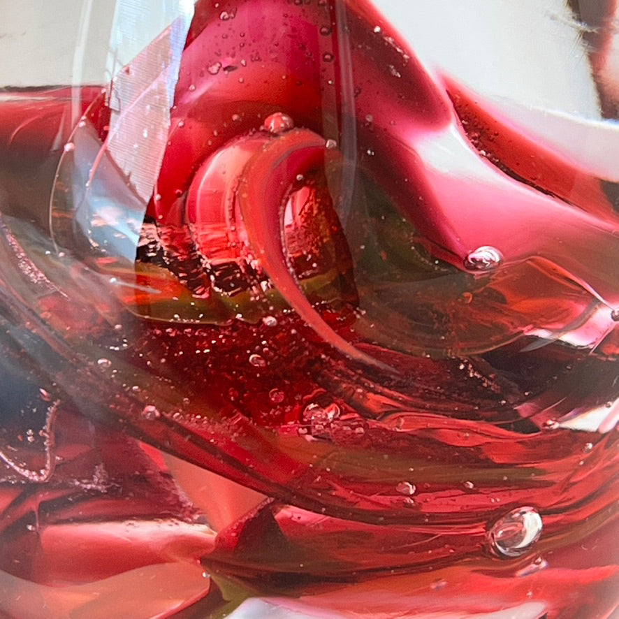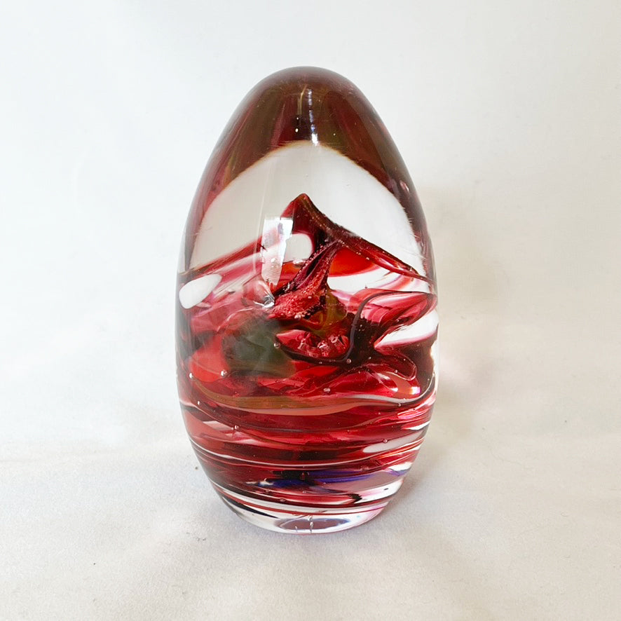 Paperweight features an egg shape with beautiful swirling shades of red, coral & pink. Measures 4" Tall