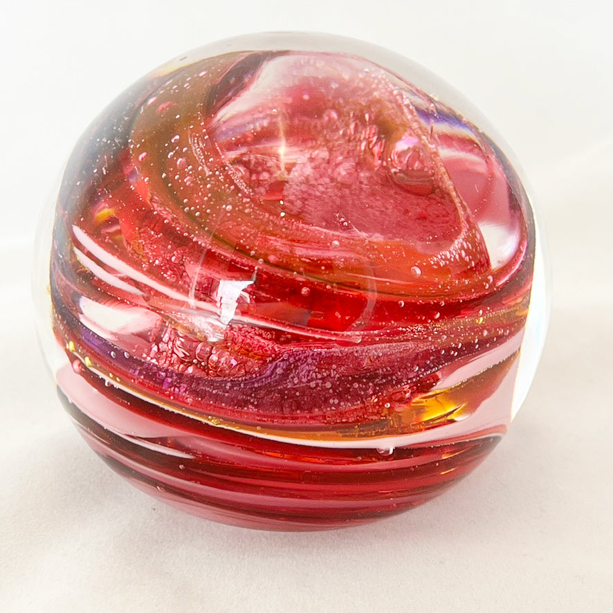 Red Marble Paperweight features ribbons of deep red, rose and pink. Measures 3" in diameter.