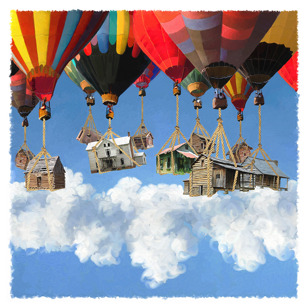 Balloon Clouds is a digital print. Up in the clouds... living in houses suspended from hot air balloons. Print is available in various sizes, on Watercolor Paper or Canvas, framed or unframed.