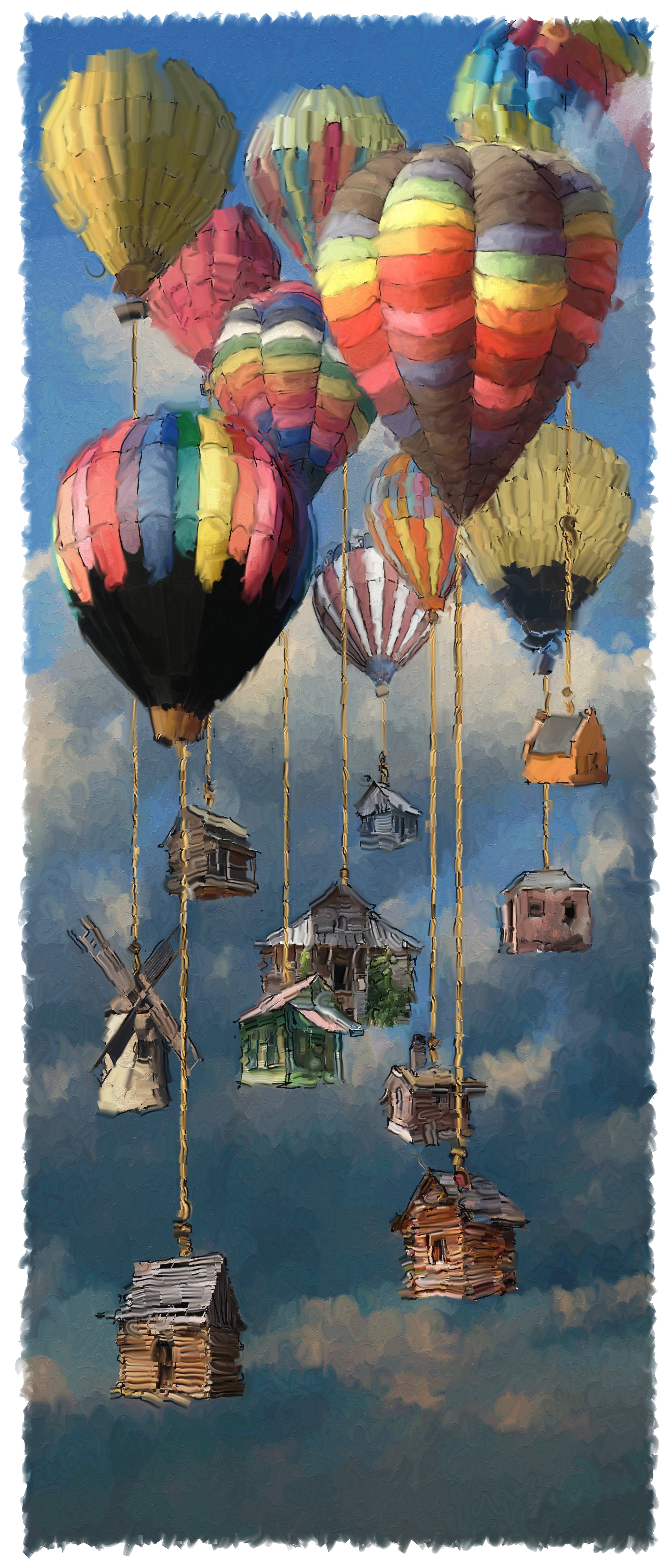 Balloon Village is a whimsical image of houses floating in the sky held up by colorful balloons. The villagers will now live above the clouds where the air is fresh and clean.  Print is available in various sizes and options