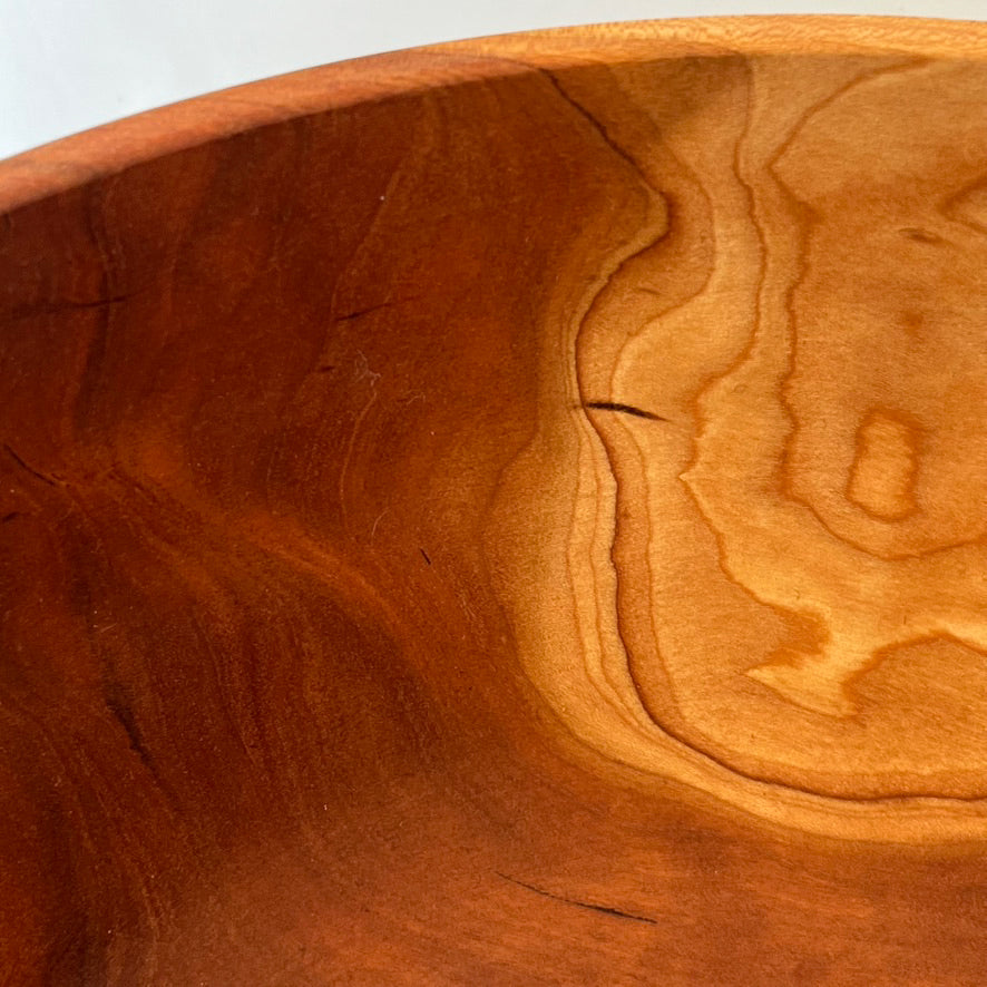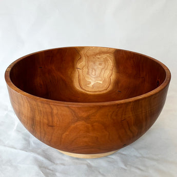 Paul Zerkel is a Michigan artist that creates one-of-a-kind wooden bowls and vases. The artist is a master at bringing out the natural colors in various woods. The Cherry Salad Bowl is beautifully finished and includes a turquoise inlay. Paul highlights the woods imperfections to become areas of beauty. Bowl is finished in food grade beeswax and measures 12.5" in diameter and 6.5" tall.