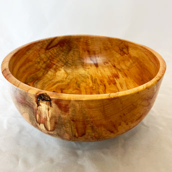 Paul Zerkel is a Michigan artist that creates one-of-a-kind wooden bowls and vases. The artist is a master at bringing out the natural colors in various woods. The Flame Box Elder Salad Bowl boasts deep reds, burnt teals and golden ribbons. Paul highlights the woods imperfections to become areas of beauty. Bowl is finished in food grade beeswax and measures 11" in diameter and 5.5" tall.