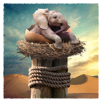 Elephant Nest features a baby elephant safe in his nest. Print is available in various sizes, on Watercolor Paper or Canvas, framed or unframed.