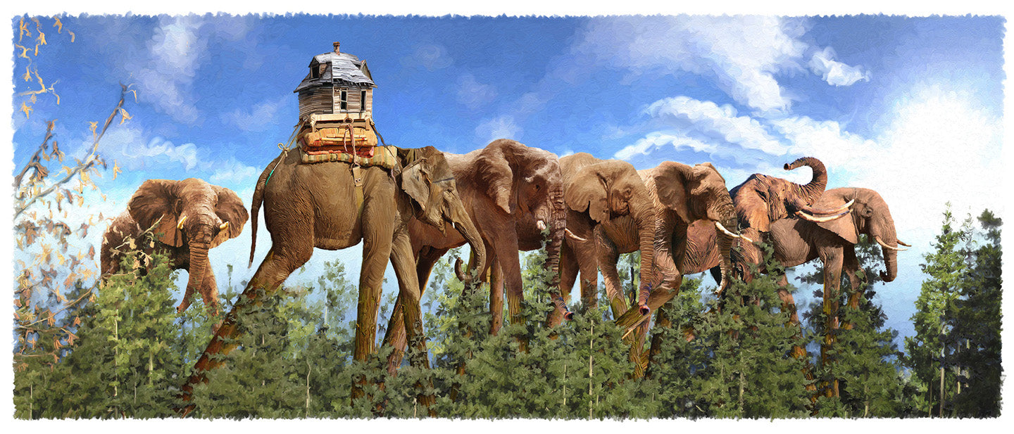 Elephant Parade features long legged elephants who may take on the monumental task of healing our sick planet. Print is available in various sizes and options