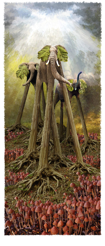Elephant Tree is a whimsical image showing how animals may adapt and evolve to live on the earth affected by changes from global warming. Print is available in various sizes and options