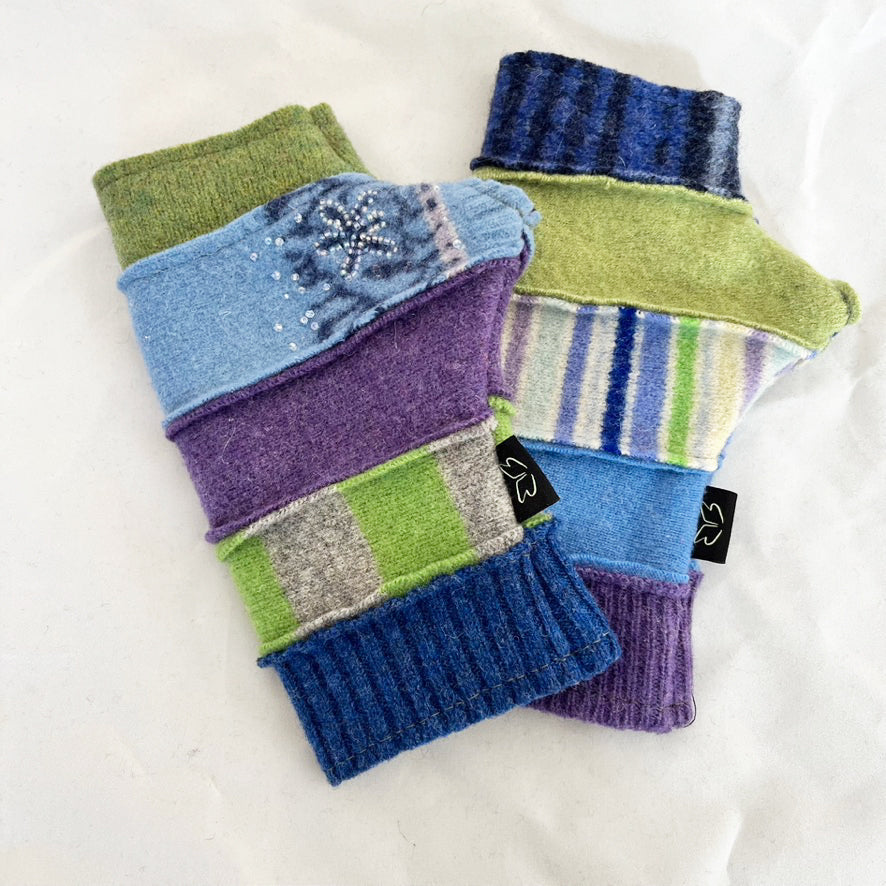 baabaaZuzu Fingerless Gloves feature blues, purple & green with beading accents are made from Vintage Wool w/Soft Fleece Interior. One of a kind.