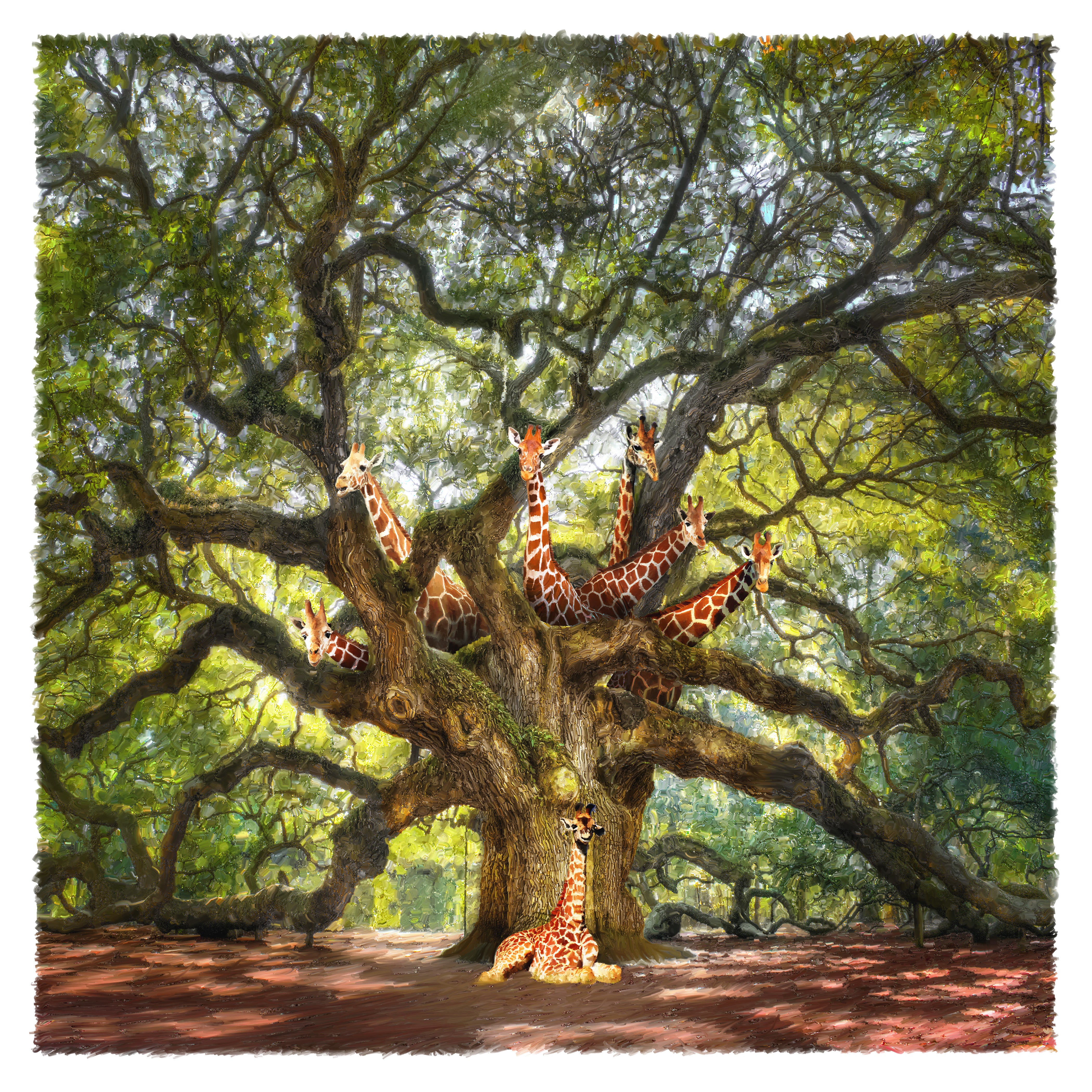 Giraffe Tree features giraffes a flock of giraffes that have evolved to live in trees. Print is available in various sizes, on Watercolor Paper or Canvas, framed or unframed.
