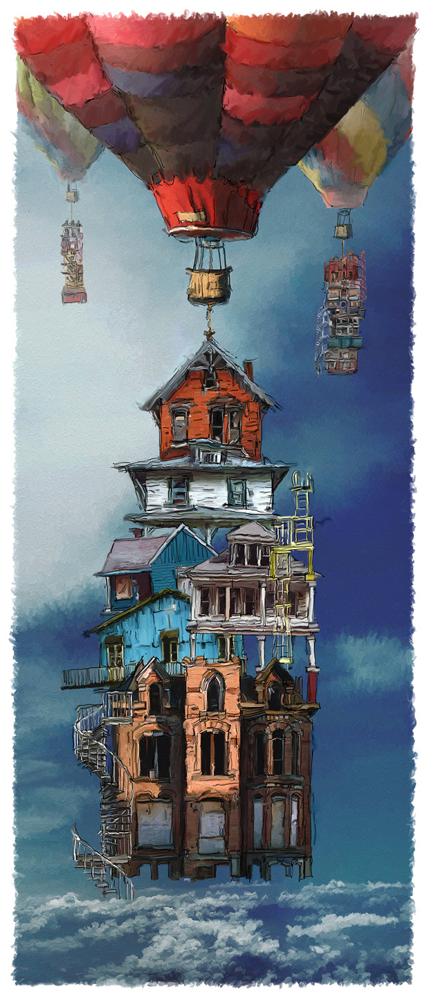 Hanging Village shows mankind floating buildings to safety using enormous hot air balloons Print is available in various sizes and options