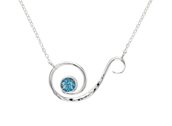 Poseiden Necklace features a compelling curl that glistens with the sparkle of a 6mm faceted stone and ends with a playful splash. The pendant hangs from a 1.4 flat cable chain. NE565
