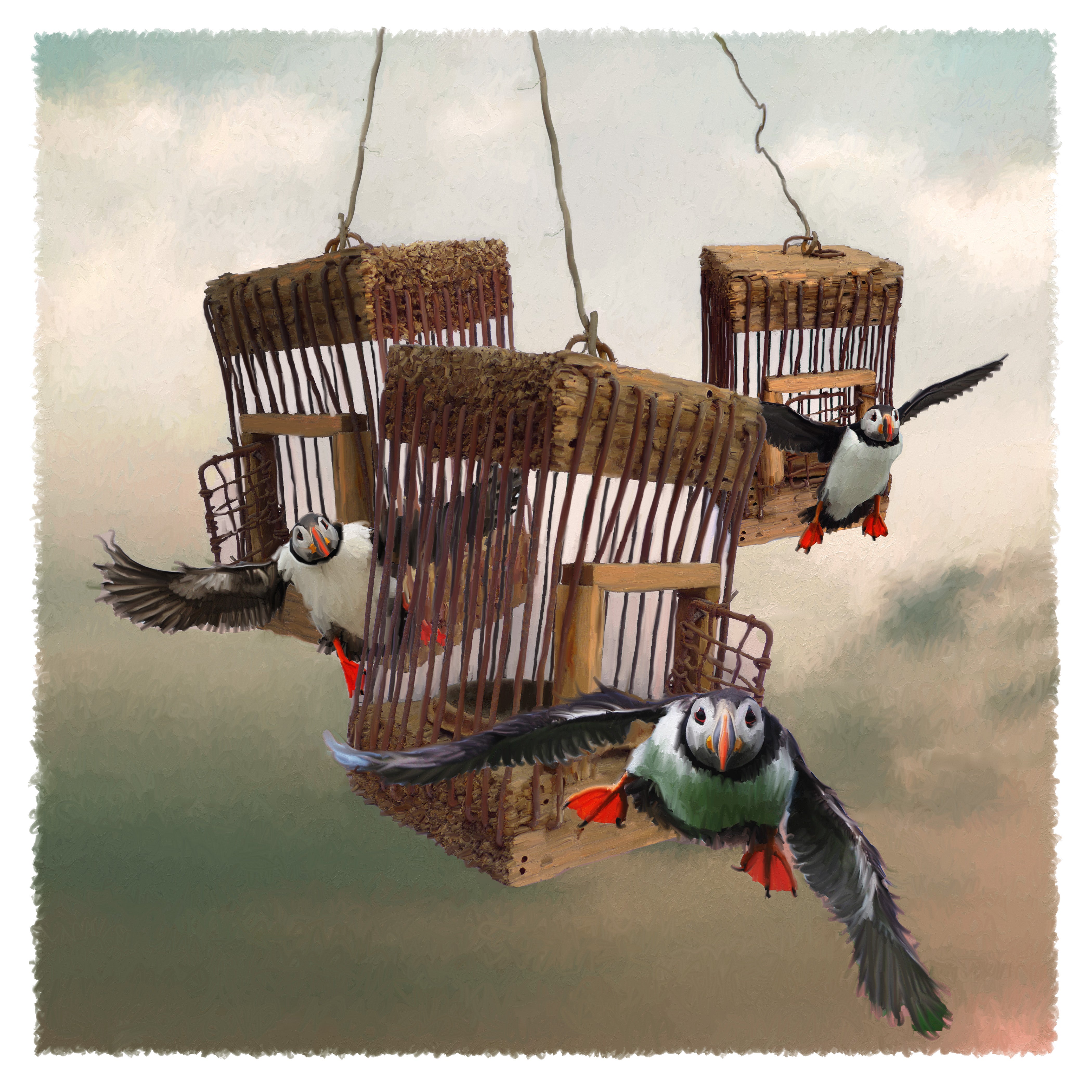 Release of the Puffins features three caged puffins finally being released into freedom. Print is available in various sizes, on Watercolor Paper or Canvas, framed or unframed.