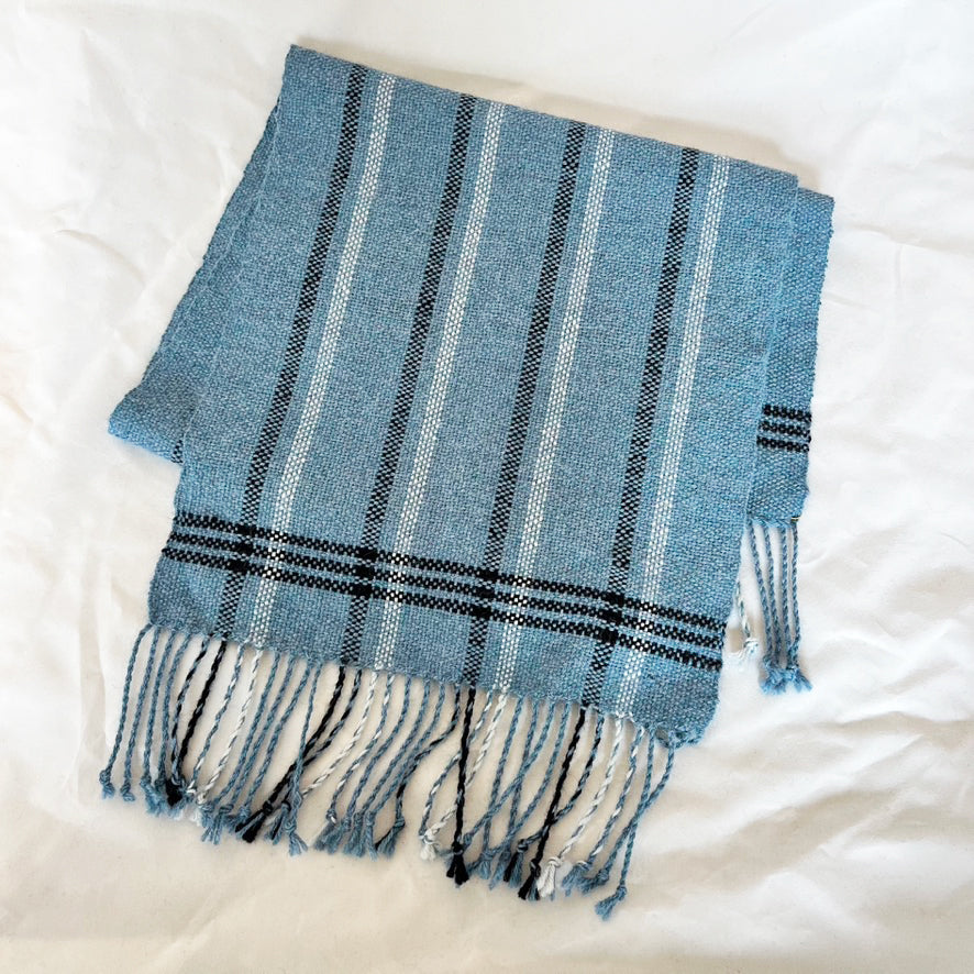 Handwoven Scarf is made of 100% Alpaca in Blue, Black & White. This one-of-a-kind scarf is created in a using one of the softest yarn possible. Baby Alpaca is soft to the touch, very warm and unlike wool it does not itch. Hand wash in lukewarm water and lay flat to dry. Measures 48"x12".