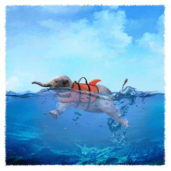 Swimming Elephant features a delightful young elephant joyfully swimming while adorning his shark-fin life jacket to keep him safe. Print is available in various sizes, on Watercolor Paper or Canvas, framed or unframed.