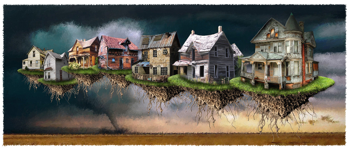 Tornado features homes that have been uprooted by a tornado but still cling safely to their roots. Print is available in various sizes and options.